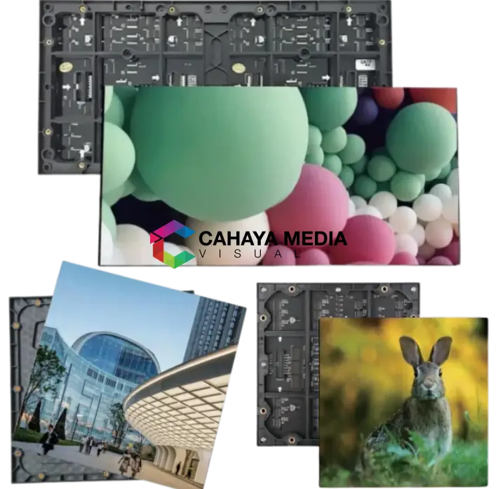 Modul LED Videotron Outdoor P4 berukuran 256x128 mm memiliki pixel pitch 4 mm, yang berarti jarak antar pusat piksel yang berdekatan adalah 4 milimeter. Resolusinya biasanya 64x32 piksel per modul. Modul ini menggunakan LED SMD (Surface-Mount Device), biasanya SMD1921 atau SMD2525, yang disusun dalam konfigurasi piksel 1R1G1B untuk tampilan warna RGB penuh.