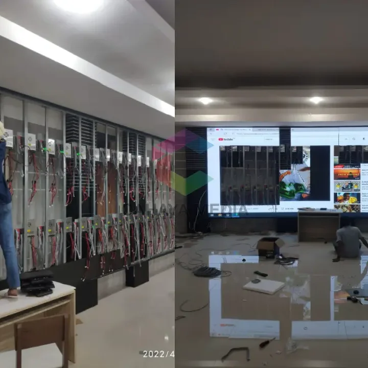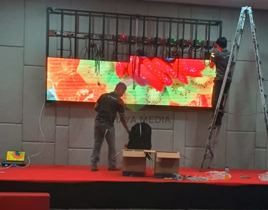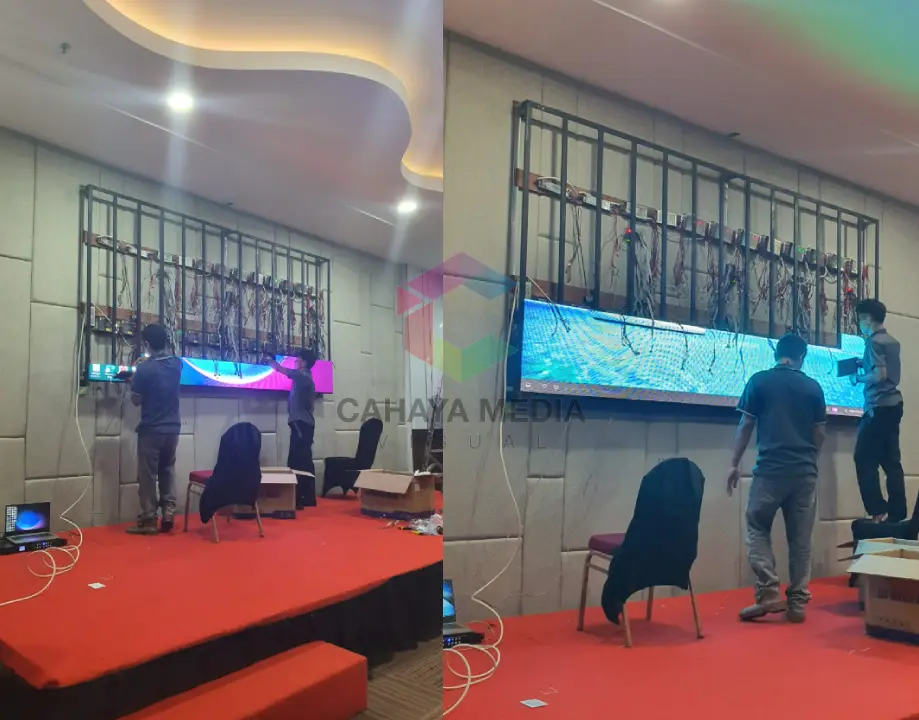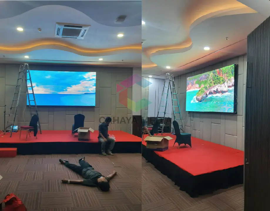 Videotron Indoor dengan ukuran 1920Hz dan dimensi sekitar 167cm x 332cm lebih cocok digunakan untuk ruangan indoor dengan jarak pandang mulai 2,5 meter ke atas. Ukuran ini cukup besar dan resolusinya yang tinggi dengan refresh rate 1920Hz akan memberikan tampilan gambar yang tajam dan nyaman dilihat dari jarak dekat hingga menengah. Umumnya, videotron jenis ini dipakai untuk ruang-ruang seperti aula, ruang konferensi, studio, atau tempat acara indoor seperti pernikahan, ulang tahun, dan acara perusahaan yang memerlukan tampilan visual yang jelas dan detail.